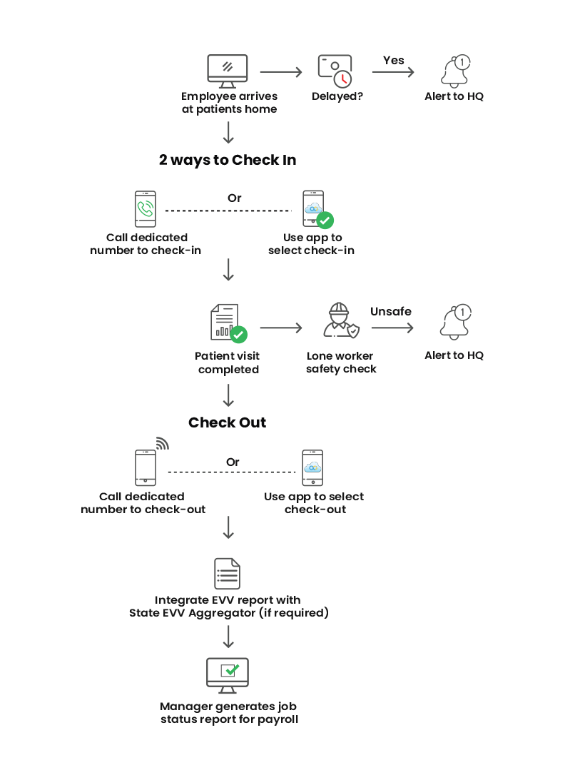 GPS-enabled Electronic Visit Verification System with compliance reporting. Automate caregiver safety monitoring and threat escalation, dispatch work orders, collect field data in real-time, Federal and State compliance reports for billing and payroll.